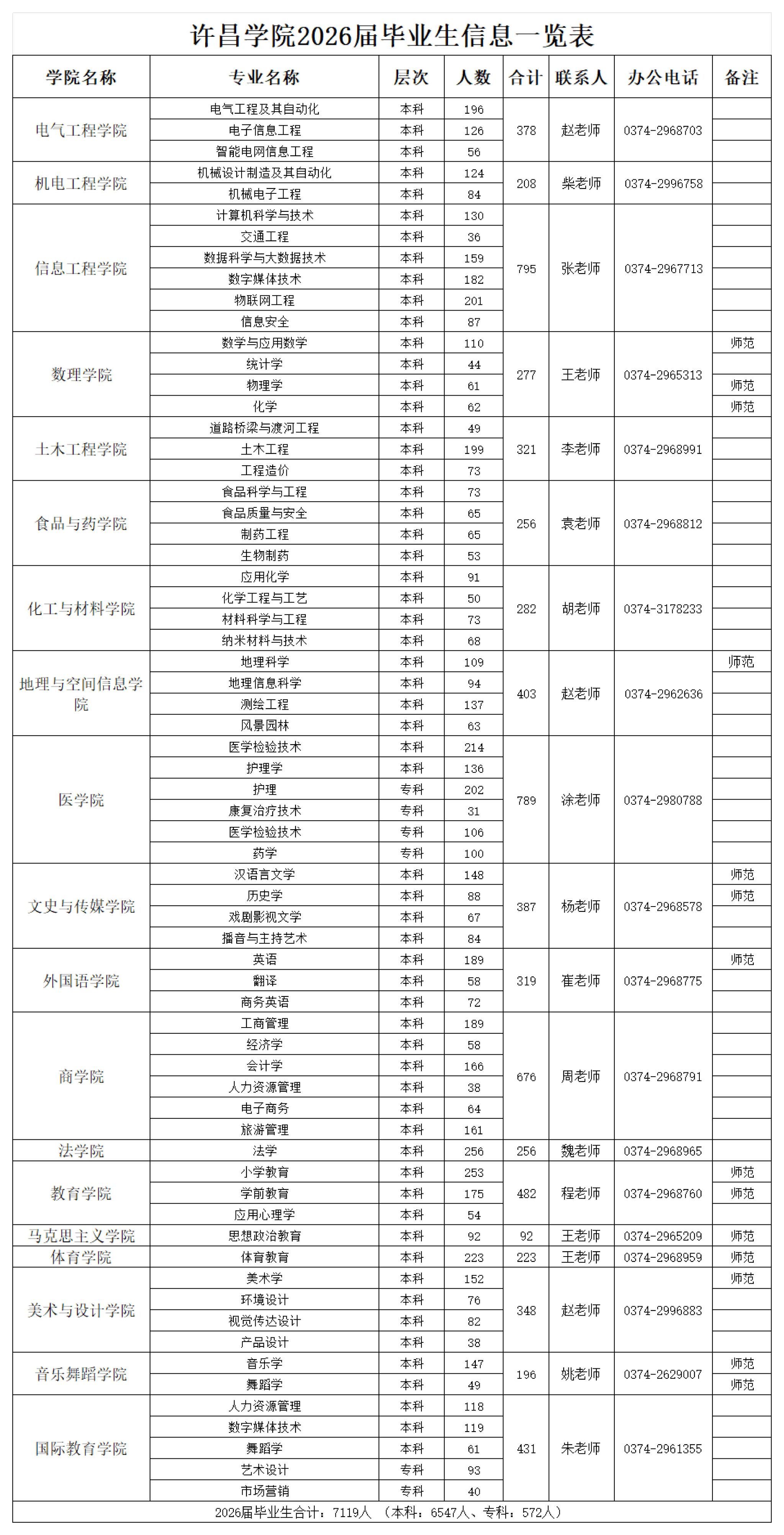 我校2026届毕业生共计7119人。其中,本科毕业生6547人,专科毕业生572人,涵盖理学、工学、文学、史学、法学、经济学、管理学、教育学、艺术学、医学等十个学科门类。