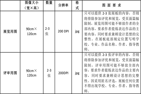参赛作品设计分为展览用图、评审用图2种形式,其中展览用图、评审用图为展板形式,要求2种规格。根据不同的用途,参展展板必须按照以下两种规格提交。