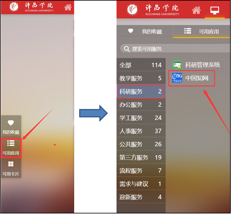(3)登录成功,点击左侧的“可用应用” ,然后选择“科研服务”,点击“中国知网”即可访问CNKI数据库的学术资源。