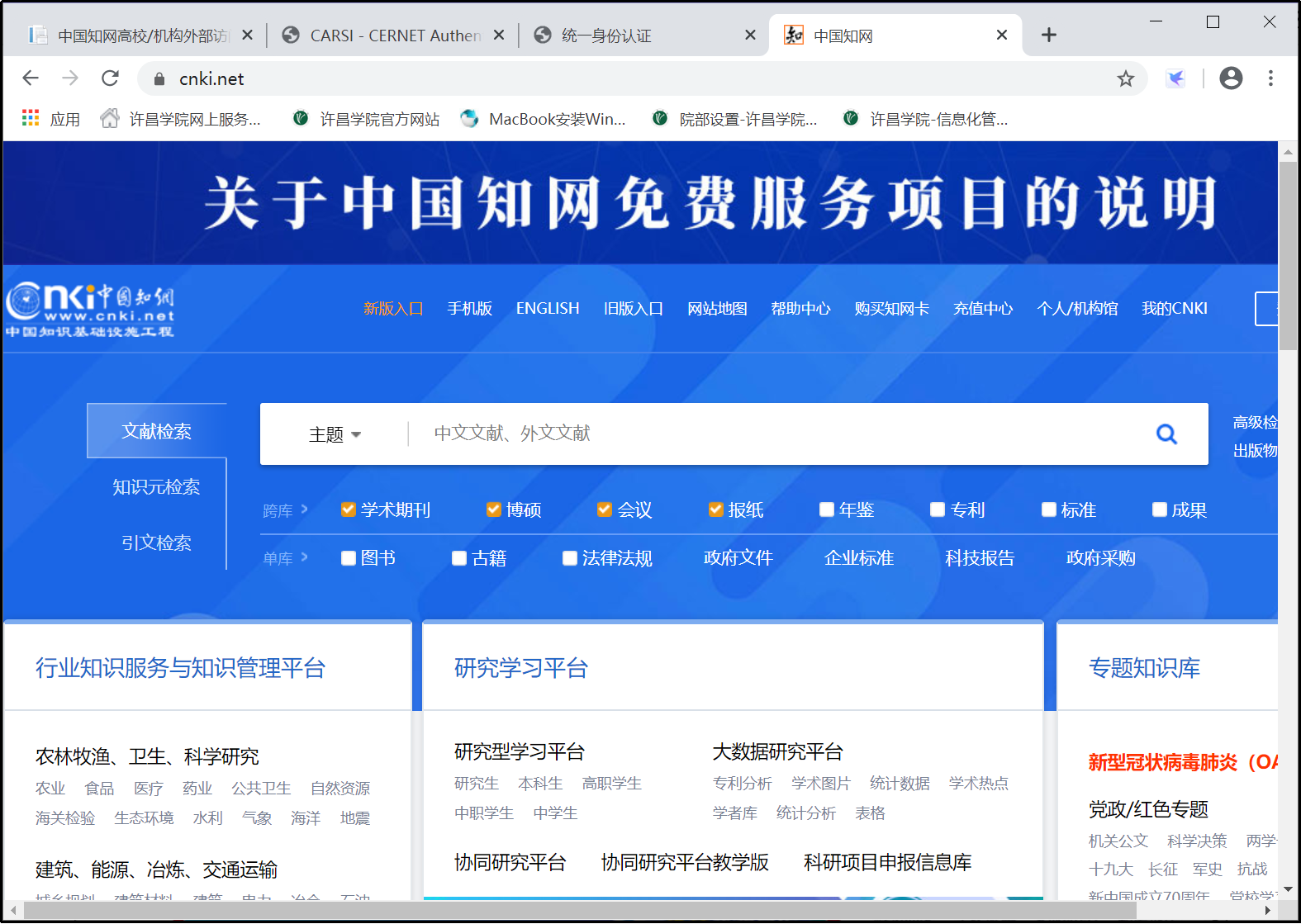 为了满足在疫情防控期间急剧增长的校外访问学术资源需求,更好的方便教师科研和学生毕业设计的顺利进行,经信息化管理中心和图书馆的共同努力,与中国教科网、CARSI联盟和中国知网的积极协调和紧密调试,我校统一认证平台已和中国教育科研计算机网CARSI平台完成了对接上线。通过该平台我校师生可在校外访问中国知网等学术资源,可以作为VPN访问方式的一种有效补充形式。