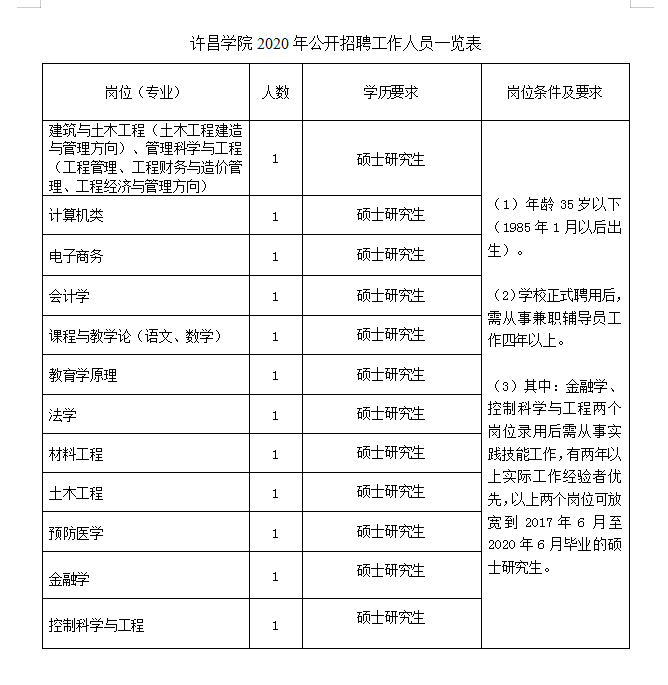 7.岗位所需的专业和其他条件(详见附件《许昌学院2020年公开招聘工作人员一览表》)。