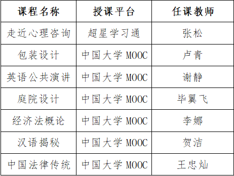 1.本学期开设线下课堂教学课程44门次,助学网络课程4门次(配备校内助学教师),独立网络课程129门次(含7门自建网络课程)。线下课堂教学安排在周一、周二的晚上第10-12节。助学网络课程采用线上线下授课模式,授课过程严格按照助学教师要求进行。独立网络课程由学生利用课余时间在网上完成课程学习及考试。开课具体详单见《20211学期公选课安排表》(附件)。