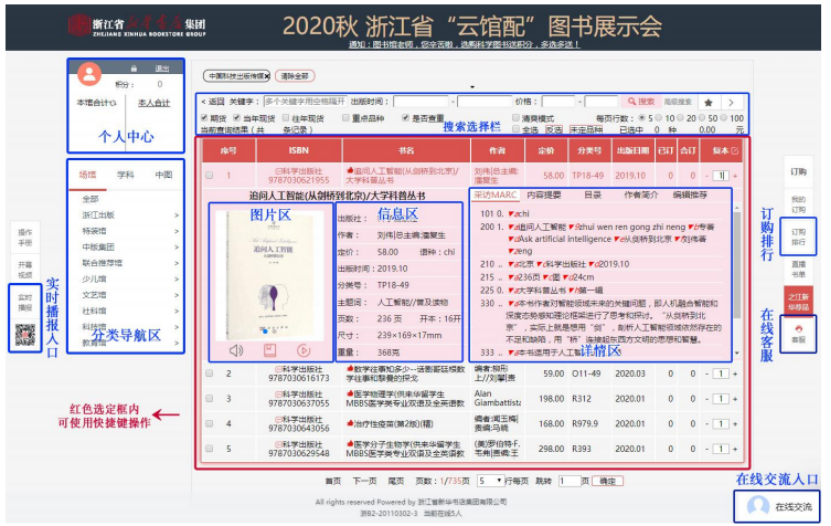 1.选购界面:用户可在本页面进行订购、检索等操作。