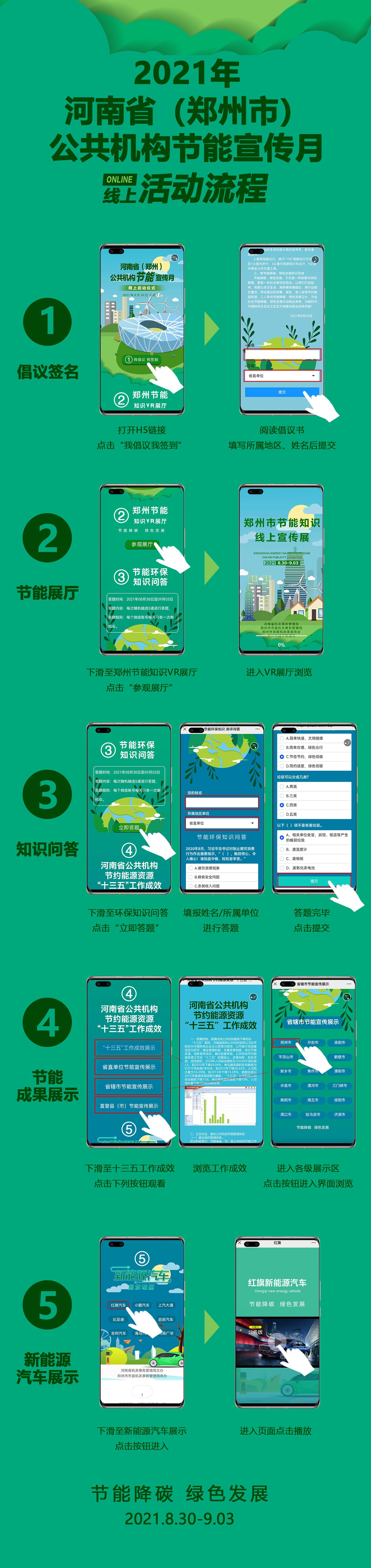 为引导公共机构践行绿色低碳生活方式,发挥公共机构示范引领作用,“河南省公共机构节能宣传月”线上系列活动已经启动,活动时间为2021.8.30至2021.9.3,扫描以下二维码即可参与,线上活动流程详见附件,欢迎我校广大师生积极参加。