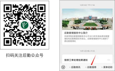 关注“许昌学院后勤管理服务中心”微信公众号,点击“后勤报修”发起报修申请。