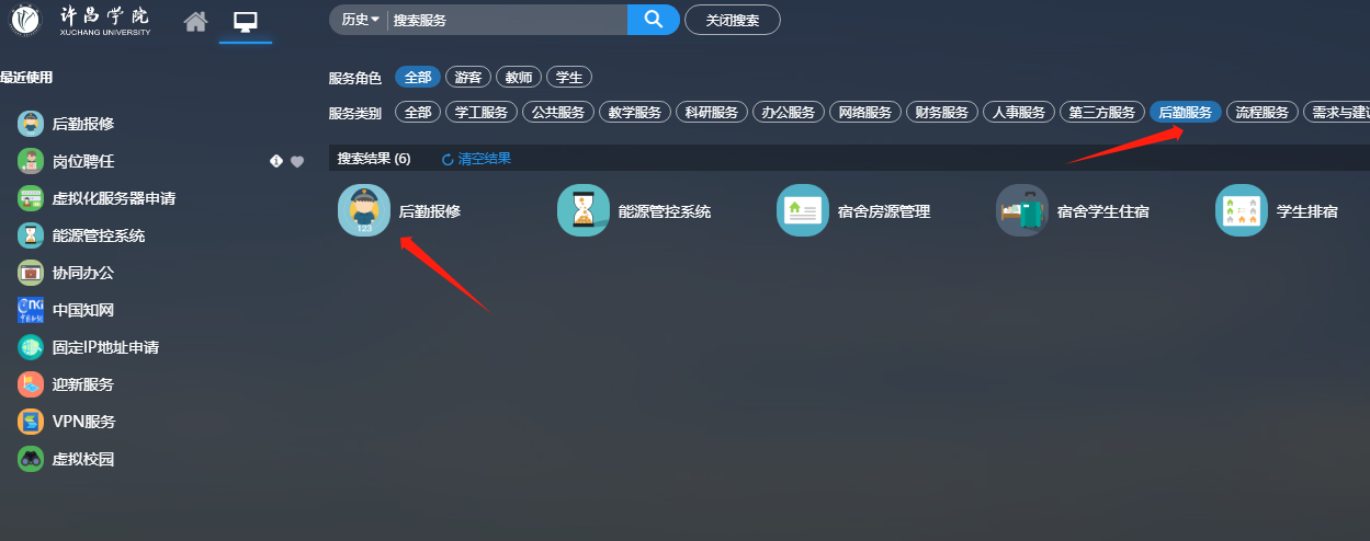 登陆学校主页“服务大厅”,找到“后勤服务”,点击“后勤报修”发起报修申请。