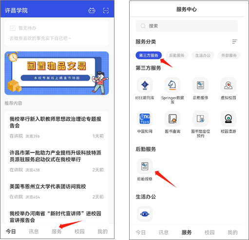 打开“今日校园”,点击“服务”,然后找到“后勤服务”点击“后勤报修”发起报修申请。