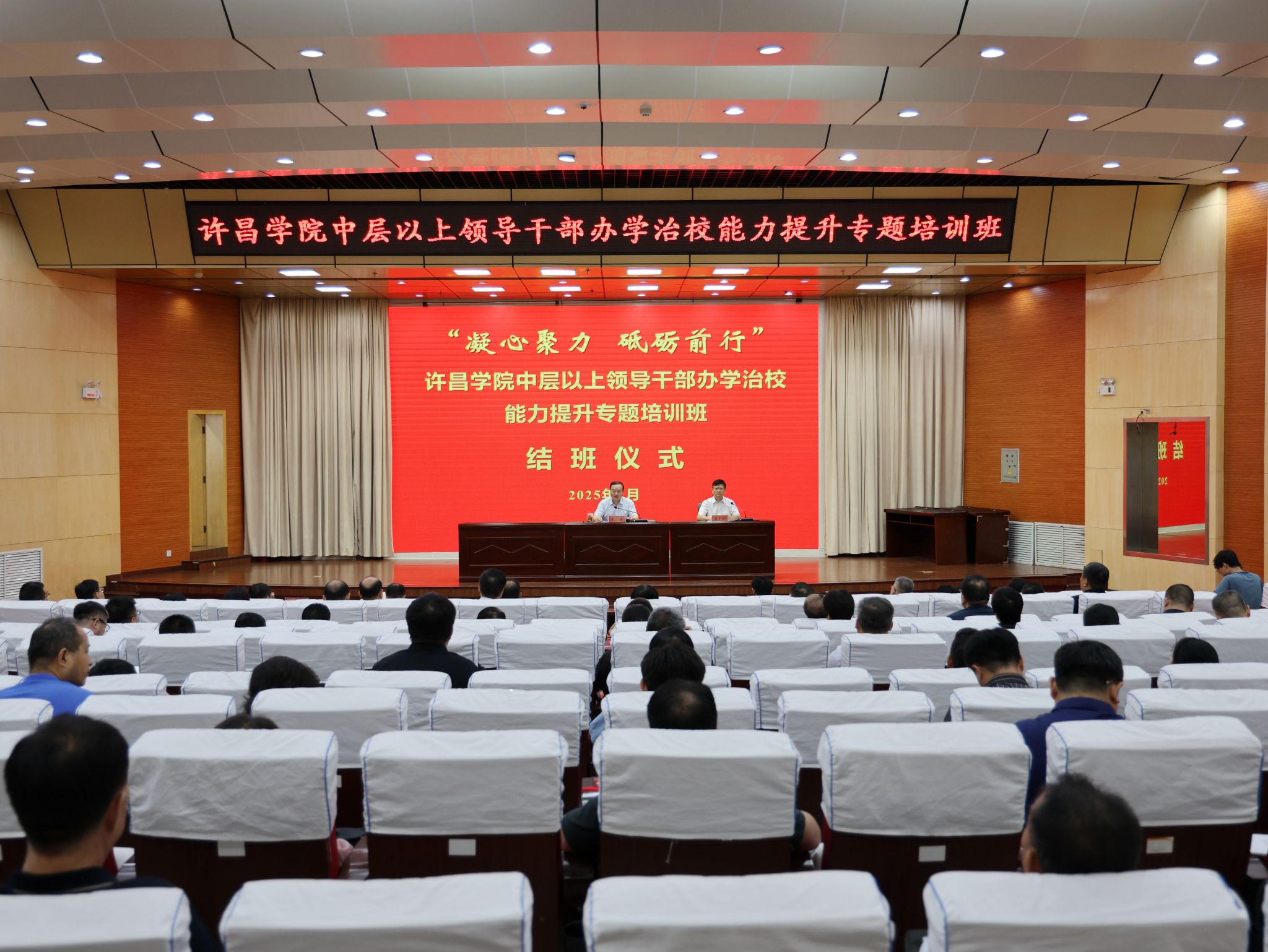 7月8日至11日,许昌学院举办“凝心聚力 砥砺前行”2025年中层以上领导干部办学治校能力提升专题培训班。11日上午,培训班结业仪式在图书馆二楼学术报告厅举行。校党委书记郭涛,校长郑直,校党委副书记、工会主席梁予昉,纪委书记、监察专员申占伟,副校长王俊、牛海鹏、冯晓民、赵艳敏出席会议。全校中层干部参加会议。会议由梁予昉主持。