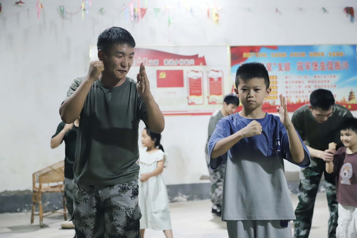 7月4日晚的徐庄社区,演出尾声,退役大学生突展军体拳,干净利落的动作掀起阵阵惊呼。随后开展的“军体拳教学”,孩子们学得认真赤诚。夜深了,数百个孩子挺直腰板,齐声诵读《少年中国说》,稚嫩坚定的声线汇成清亮声浪,穿透心灵,这是他们铭记历史、立志报国的庄严承诺。