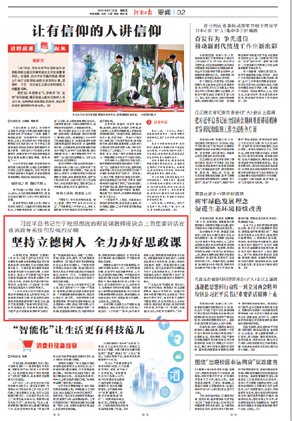 本报讯(记者周晓荷 史晓琪)3月18日,习近平总书记主持召开学校思想政治理论课教师座谈会并发表重要讲话,深刻阐述了办好思政课的重大意义。习近平总书记重要讲话在我省教育系统引发强烈反响,大家纷纷表示,要深入学习贯彻习近平总书记重要讲话精神,坚持把立德树人作为根本任务,坚持扎根中原大地办好思政课,立足岗位,守正创新,努力培养担当民族复兴大任的时代新人。