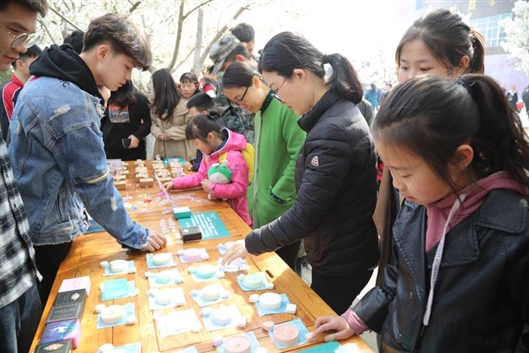 樱花大道上,化学化工学院学生制作的樱花手工皂吸引了来往游客的目光。化学化工学院结合专业知识,以牛奶、火山泥为原料,利用皂化反应制作出了纯天然的外形美观且实用性极高的手工皂,并刻成各色各样的樱花花型。同时,同学们的另一杰作“樱花树脂”也吸引众人驻足观看,学生通过环氧树脂与樱花的化学结合,将樱花盛开的美丽瞬间保留在树脂中。
