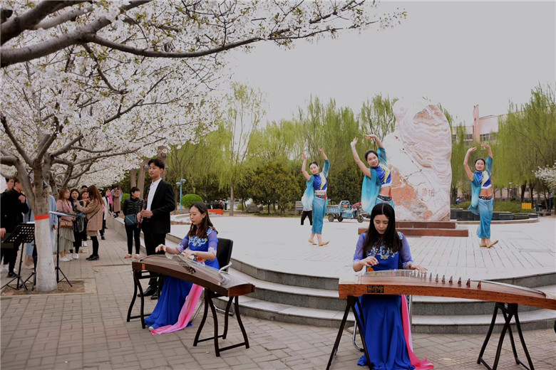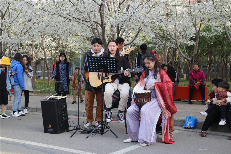 学校樱花大道两旁,各社团开展着丰富多彩的活动,不时有音乐舞蹈学院师生和大学生艺术团的同学们通过无伴奏人声合唱、民谣吉他弹唱等,传递着他们的专业才华和“校园好声音”。