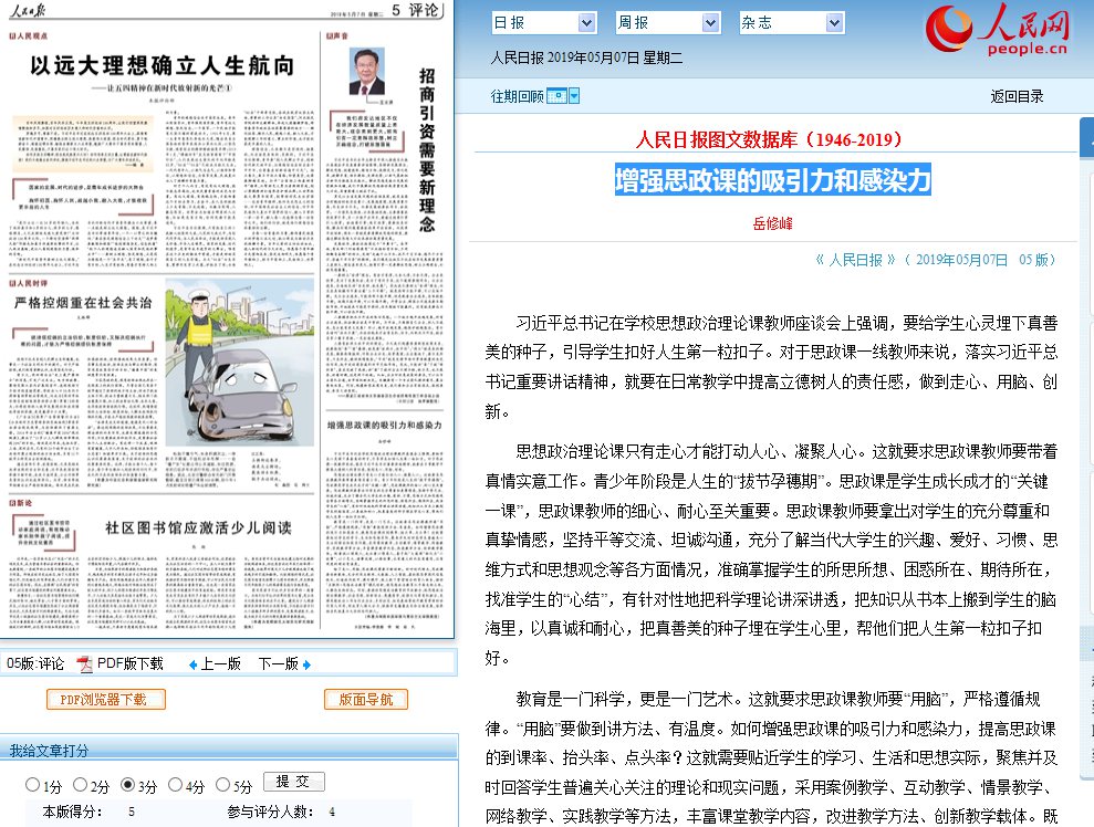 5月7日,《人民日报》第5版评论版刊发院长岳修峰教授署名文章《增强思政课的吸引力和感染力》,并在学习强国等平台上推出。