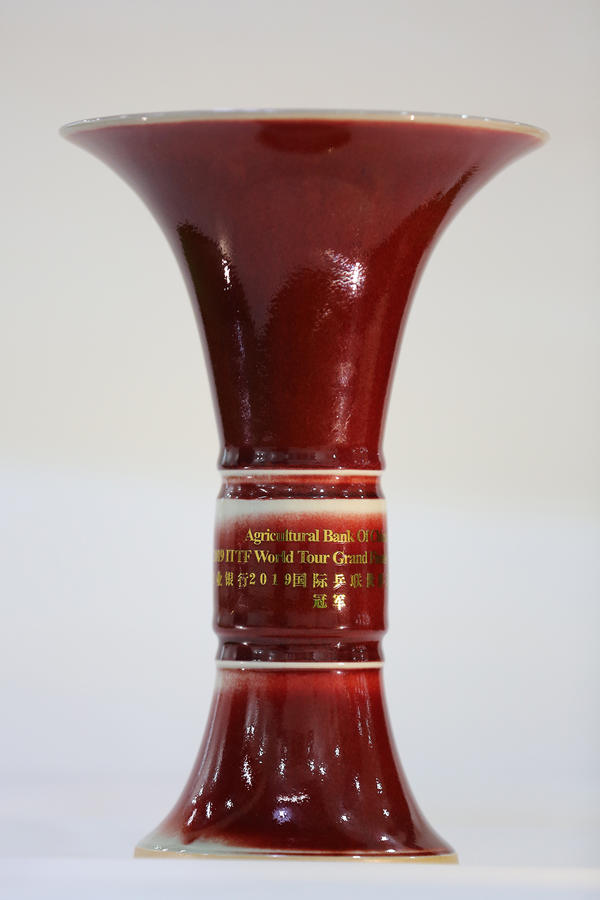 奖杯通高28厘米,上口直径18厘米,底座直径12厘米,手握部分直径6.5厘米。手握部分烧制有金色“2019国际乒联世界巡回赛总决赛男单冠军”等中英文对照文字。据悉,本赛赛事共颁发了男单、女单、男双、女双、混双8座冠军奖杯。