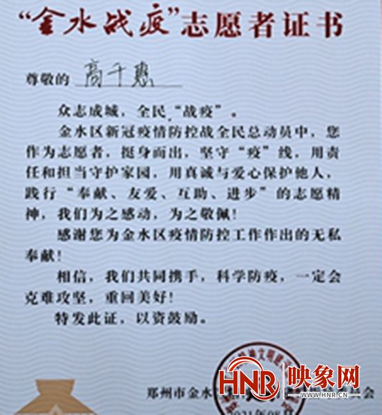 电气与机械工程学院2019级学生史胜冉,在郑州疫情暴发后,第一时间报名做了防疫志愿者。工作中,她服从分配,先后参与了毛庄安置区、金地广场、九鼎公租房等疫情防控卡点的值班值守、全民核酸检测等。在近半个月的志愿服务期间,为疫情早点结束做出了力所能及的贡献。