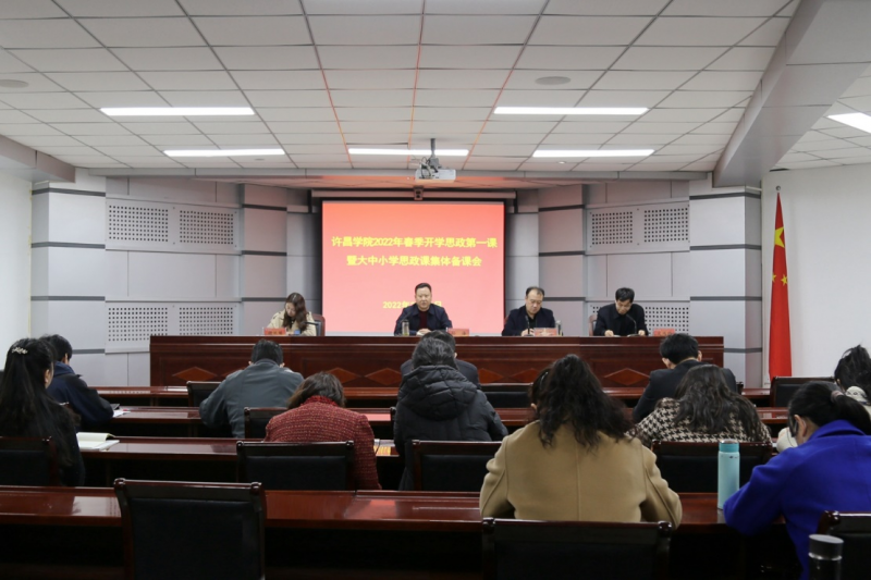 2 月 28 日,由中共河南省委教育工委、河南省教育厅主办,商丘师范学院、商丘市教育体育局承办的2022年春季开学思政第一课暨大中小学思政课集体备课活动如期举行。许昌学院在办公楼第三会议室设立分会场收看视频直播。校党委副书记孙海,党委宣传部、马克思主义学院单位负责人,全体思政课教师和其它学院部分教师代表共60余人参加分会场直播活动。