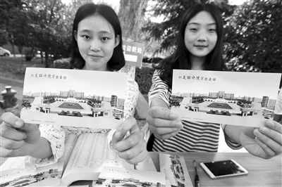 两名大学生展示报到时收到的特殊礼物——明信片。记者 牛书培 摄
