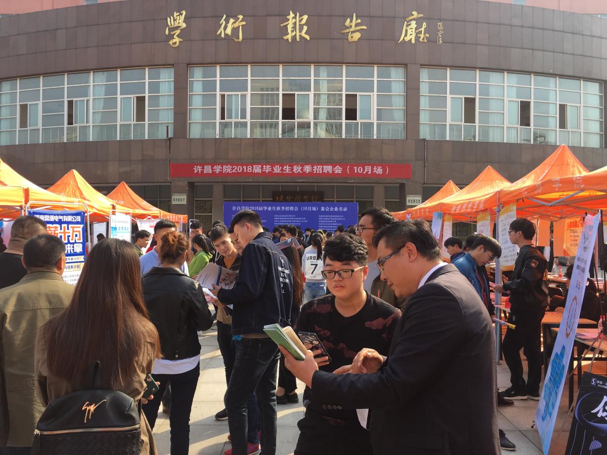 11月17日,由许昌市人力资源和社会保障局与我校联合举办的许昌市2018届高校毕业生冬季双向选择洽谈会在我校学术报告厅前广场举行。本次冬季洽谈会共吸引河南黄河旋风股份有限公司、众品集团、河南瑞贝卡集团等200家企业到现场进行人才招聘,岗位需求涵盖本科及高职高专学历层次的各个专业,4000多名毕业生进场求职。