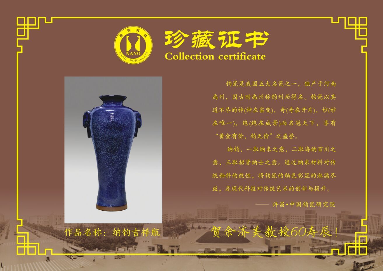 钧瓷是河南的一大文化品牌,开展钧瓷工艺的改进与研究,对弘扬、传承这项国家非物质文化遗产具有重要意义。早在2011年,表面微纳米材料研究所就开始了与河南大宋官窑瓷业有限公司的合作,成立了“大宋官窑研发实验室”, 并将其建成了材料专业的教学实践基地以及产学研合作基地。2013年,纳米所与大宋官窑签订了技术委托合同,进行钧瓷釉料改性应用研究。多年来,郑直团队通过对传统钧瓷釉料的科学分析,将纳米材料与传统釉料结合,成功研发了一系列的钧瓷产品,釉面玉润典雅,提高了钧瓷的艺术观赏价值,实现了钧瓷传统工艺与现代纳米技术的完美结合。学院为这种新型的钧瓷产品注册了“纳钧”商标,2016年5月,这种“纳米材料改性技术”以50万元的转让费转让给河南大宋官窑股份有限公司。