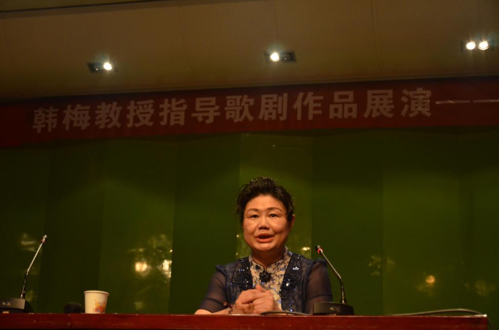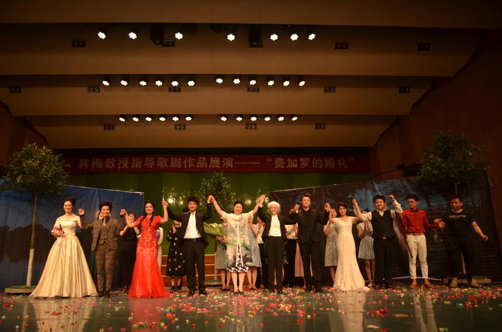 韩梅教授现任河南大学艺术学院副院长,教授,硕士生导师(国内声乐最高学位为硕士),中国教育学会音乐教育专业委员会声乐学术委员,河南省硕士专业学位教育指导委员会委员,中国声乐家协会副主席。多年来,她致力于中外歌剧的教学与实践,并率先在舞台上尝试歌剧的演唱与表演,用中国人的理解来诠释西方经典歌剧。此次在我校上演的《费加罗的婚礼》,是莫扎特最杰出的三部歌剧中的一部喜歌,是具有典型意大利风格的歌剧。诙谐幽默的剧情配合演员们的精彩演绎,让观众们深深陶醉;当剧中一首首耳熟能详的世界名曲在观众耳边响起时,一些艺术爱好者也不由地跟着低声哼唱起来;每到一曲优美的咏叹调结束,大家都会情不自禁地报以热烈的掌声。演出结束后,观众纷纷上台,将美丽的鲜花送给演员,表达对这台精彩演出的赞叹与对演员的敬意。