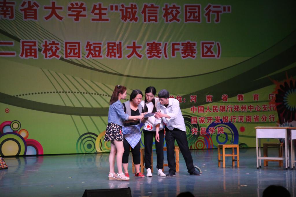 本届比赛由河南省教育厅、中国人民银行郑州中心支行、国家开发银行股份有限公司河南分行共同主办,比赛主题是“诚信舞台 演绎青春”。上午8时,本次短剧大赛在河南农业职业学院选送的《诚作本 爱为根》的演出中正式拉开帷幕。郑州轻工业学院、河南农业大学、许昌学院、郑州航空工业管理学院等高校先后登台演出。经过一天的激烈角逐,我校的《彼岸花》、《女生宿舍》等五部作品获得一等奖,郑州航空工业管理学院的《“贷”来希望》等六部作品获得二等奖,郑州科技学院的《诚实的魔镜》等七部作品获得三等奖。本次大赛还评选出了最佳男女演员奖、优秀导演奖、最佳舞台效果奖以及最佳指导老师奖。其中,我校指导老师刘毅飞、訾冉获得最佳指导教师奖,我校学生霍斌琪获得最佳男演员奖,音乐舞蹈学院选送的参赛作品《彼岸花》获得最佳舞台效果奖。