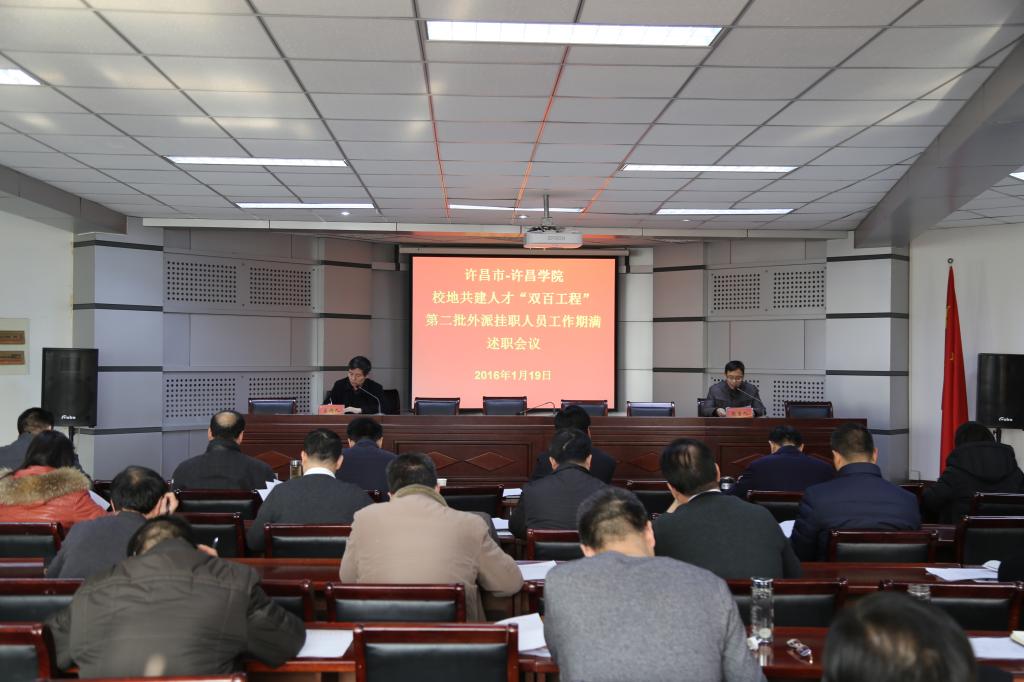 1月19日,我校在办公楼第三会议室召开“双百工程”第二批外派到许昌市挂职人员述职会议。党委副书记马超、副院长郑直、崔斌、黄怡俐,许昌市委人才办主任吕玉峰、许昌市委组织部人才科科长黄海军以及我校相关职能和院部负责人作为考核评委参加会议。
