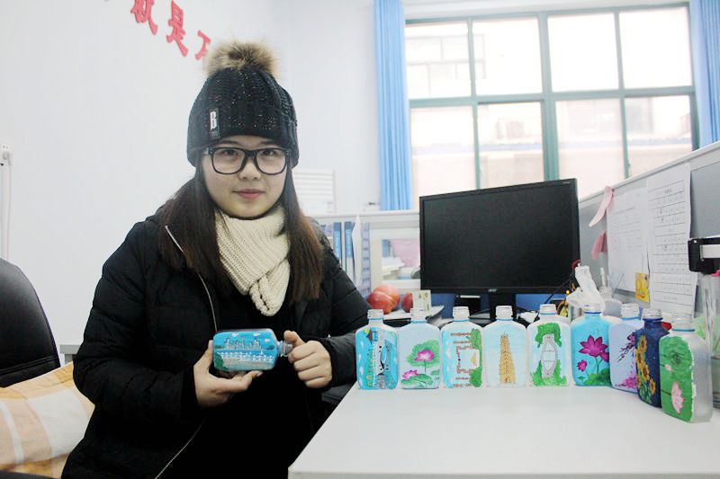 这个创意,来自我校美术学院一名大四学生赵甜甜。“我今年在实习期,教七年级学生上美术课。课本里有关于校服设计的课程,但学生不懂色彩的搭配。因此,我想通过这种酒瓶作画的方式,让同学们在实践中学习色彩搭配,同时也了解变废为宝的环保理念。”赵甜甜说。家里人平时喝酒积攒下来的酒瓶正好可以派上用场,不过这还远远不够,为了收集到更适合画水粉画的方形酒瓶,周末她特意跑了好几家饭店询问,很多店家听说她要用酒瓶作画,就把存的酒瓶全送给了她。