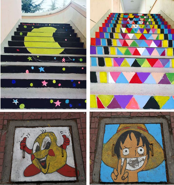 校内彩绘的楼梯、井盖