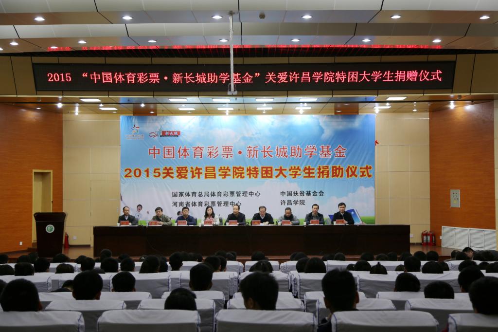 12月17日上午,2015“中国体育彩票·新长城助学基金”关爱许昌学院优秀困难大学生捐助仪式在我校学术报告厅举行。河南省体育彩票管理中心主任孙和平,中国扶贫基金会品牌传播主管马楠楠、人民日报体育部综合室主任王霞光、许昌市体育局副局长赵西川、省体彩中心许昌分中心主任胡波,我校副院长郭涛等领导出席了本次捐助仪式。参加仪式的还有各学院党总支书记、副书记、辅导员、受资助学生、体彩网点业主、销售员代表。人民日报、国家彩票杂志、新浪网、河南日报、河南电视台都市频道、河南电视台民生频道、大河报、河南商报等10余家省级以上新闻媒体对捐助仪式进行了采访报道。捐助仪式由学生处处长张鹏辉主持。