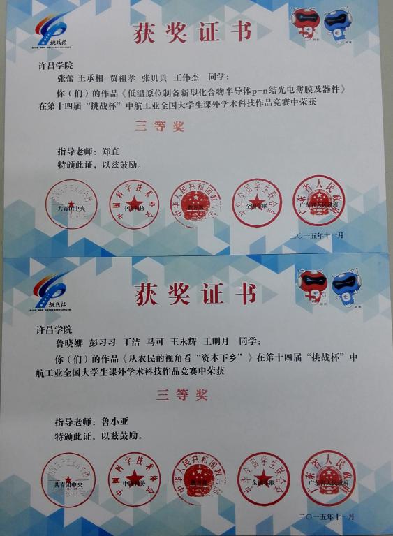经过项目展示、终审答辩、评委评审等环节,我校由郑直副院长,许志宏、雷岩、贾会敏老师指导,贾祖孝等同学的作品《低温元素直接反应制备异质结光电薄膜及器件》和由鲁小亚、吕金洲老师指导,鲁晓娜等同学的作品《资本下乡:困境与机遇》荣获第十四届“挑战杯”中航工业全国大学生课外学术科技作品竞赛三等奖。副院长郑直荣获“优秀指导教师”称号。