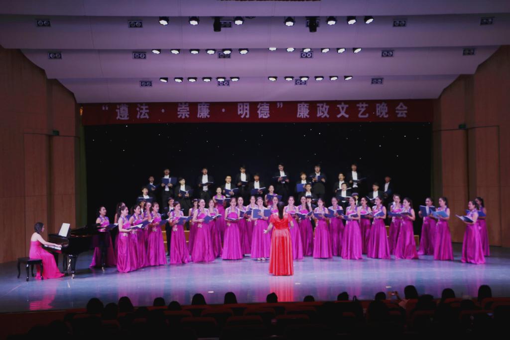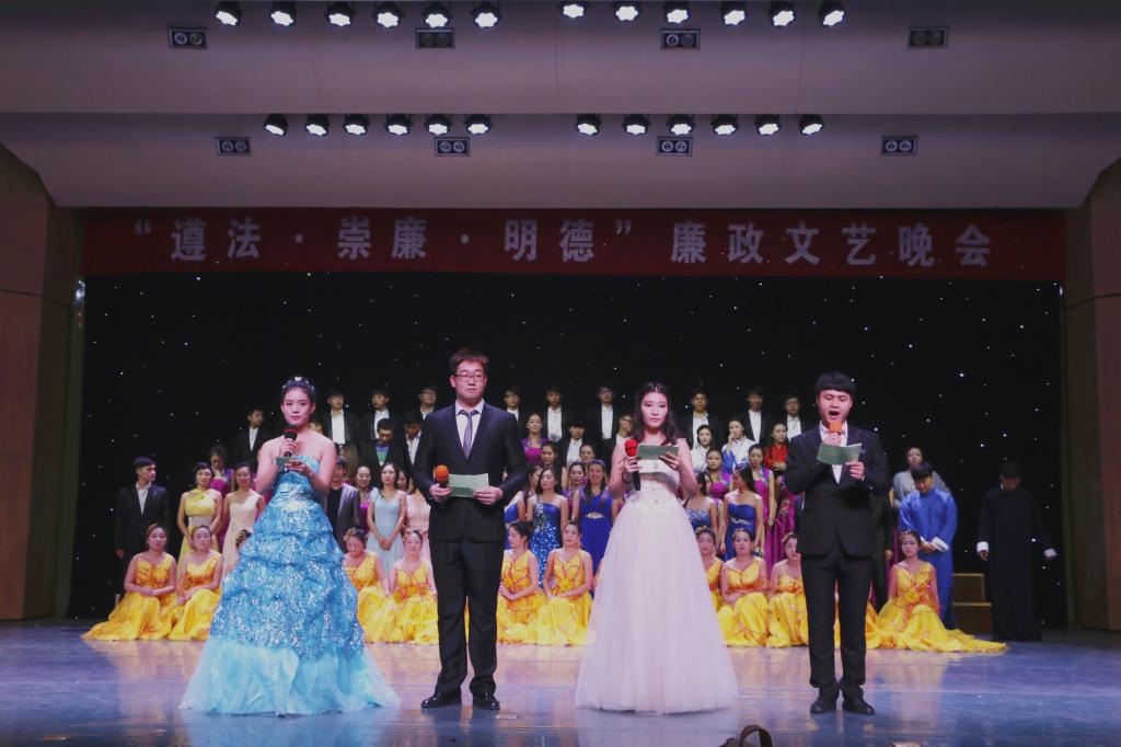 本场晚会是我校音乐舞蹈学院廉政文化建设月活动的重要内容之一,活动得到了全院师生的大力支持,晚会节目中,有4首廉政曲目和1个相声节目均为师生原创。通过晚会这种师生喜闻乐见的形式,来展现廉政文化建设的成果,既是一种形式创新,也是一种有效的宣传方式,必将有力地推动我校的廉政文化建设,营造遵法·崇廉·明德校园文化氛围,助力我校转型发展。(图片由音乐舞蹈学院提供)
