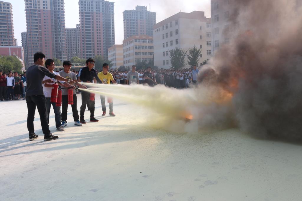 老师,进行了灭火器的实际操作,其他师生列队观摩灭火演练。整个演练分八批进行,持续了两个下午。