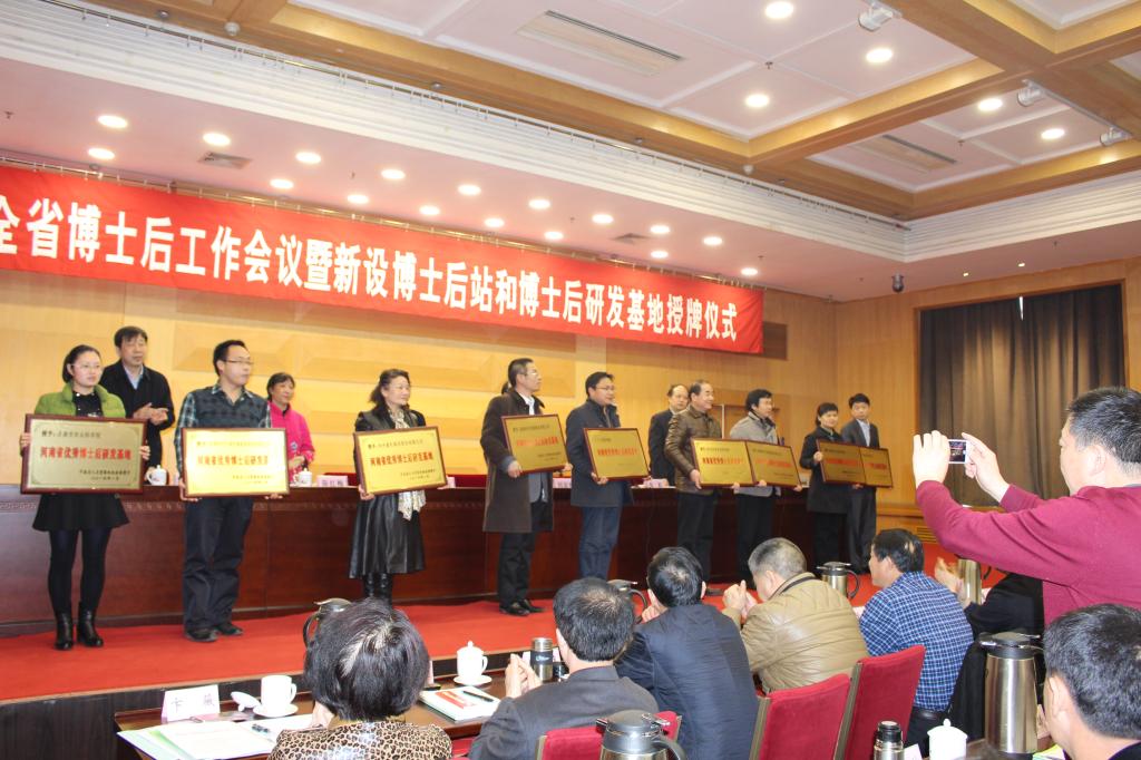 上午,河南省人力资源和社会保障厅在河南省人民会堂隆重召开了2015年全省博士后工作会议,省人力资源和社会保障厅、省教育厅、省科学技术厅、省财政厅等单位有关领导出席会议并作重要讲话。会上,省博管办主任张彩宣读了《关于表彰2014年度河南省博士后工作先进单位优秀博士后站博士后研发基地和优秀个人的通报》(豫人社博管【2015】6号文),对2014年度博士后工作先进单位和个人进行了表彰。我校再次获得河南省“优秀博士后研发基地”荣誉称号,并作为优秀博士后研发基地代表上台领奖。