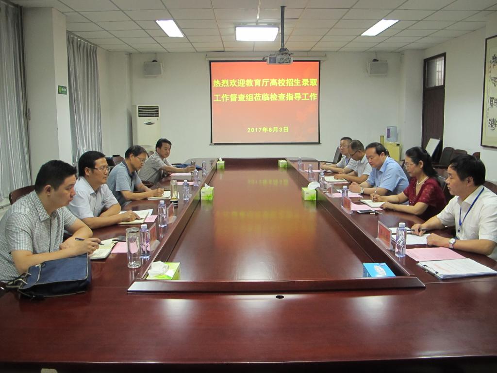 8月3日下午,省教育厅高校纪工委副书记、纪检组副组长王瑜一行四人莅临我校,检查指导学校2017年招生录取工作。我校在办公楼第一会议室召开汇报会,副院长郭涛出席会议,党政办公室、纪委(监察处)办公室和招生办公室等相关单位负责人参加了汇报会。