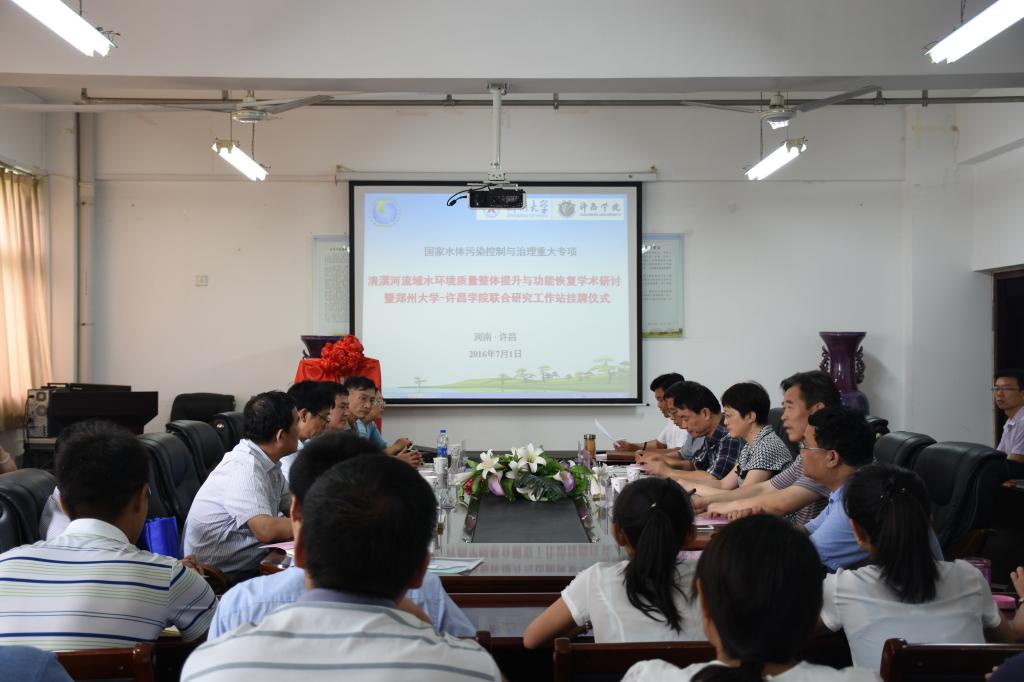会上,郑直副院长致辞。他简要介绍了许昌学院的教学院部和特色专业,并介绍了许昌学院近年来所取得的办学成绩,他指出郑州大学和许昌学院联合研究工作站的建立标志着我校在推进产学研合作、水环境科技创新方面取得了新成效,必将对清潩河流域水环境的提升产生积极的作用和示范效应。郑州大学水利与环境学院院长吴泽宁指出,清潩河流域水环境整体提升工程是国家十二五重大水利专项,与许昌学院共建是该专项的一个特色,希望研究工作站抓好这个机会,开展深入研究,为清潩河流域水环境质量整体提升服务。据介绍,郑州大学—许昌学院联合研究工作站的成立,将充分发挥双方科研技术优势,实现强强联手,协同攻关,重点突破和解决湖泊富营养化、重金属污染防治和流域大气污染治理中存在的一些核心共性与重大关键技术问题,产出一批标志性科技成果,培养出一批高水平环境保护科技人才。