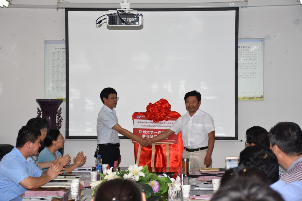 我校城乡规划与园林学院院长吴国玺和郑州大学水利与环境学院院长吴泽宁共同为郑州大学—许昌学院联合研究工作站揭牌。