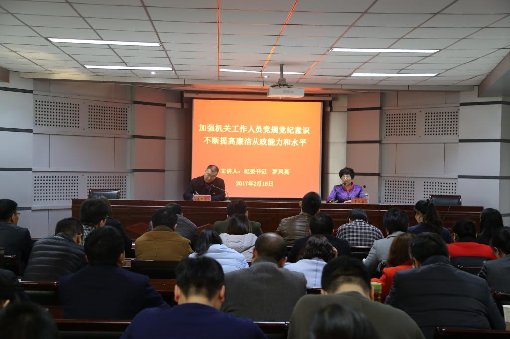 2月16日下午,我校在办公楼第三会议室组织开展科级干部“改进工作作风、提升工作效能”专题培训。校纪委书记罗凤英讲了题为《加强机关工作人员党规党纪意识 不断提高廉洁从政能力和水平》的廉政党课。机关科级干部及二级单位办公室主任共130余人聆听了党课。