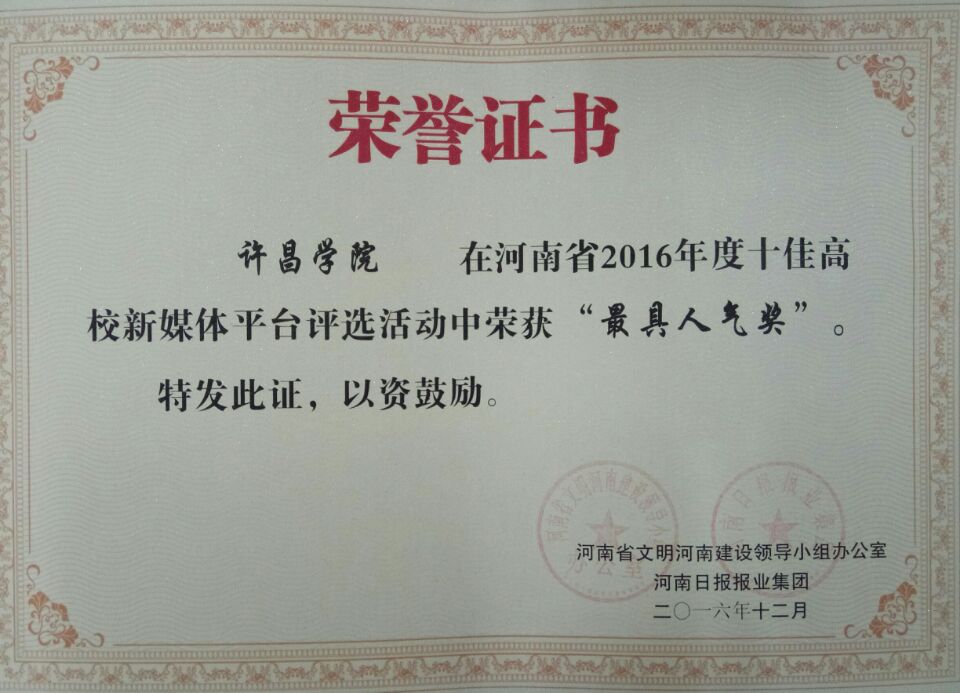 12月18日,由河南省委宣传部、河南日报报业集团主办的河南省首届大学生新媒体原创作品大赛暨2016年度十佳高校新媒体平台颁奖典礼在郑州举行,我校官方微信平台荣获2016年度河南高校新媒体“最具人气奖”。