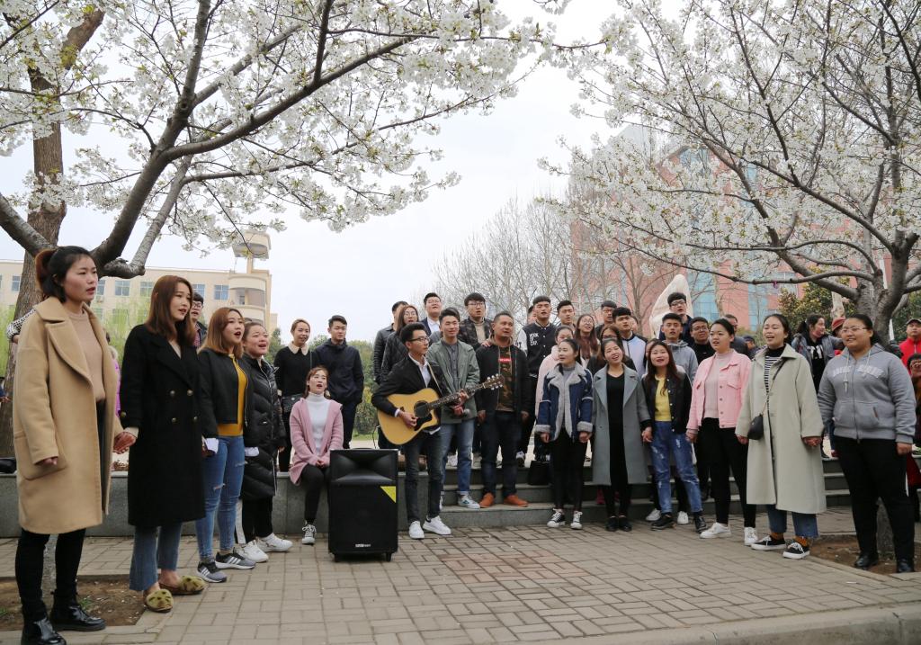 “分别总是在九月,回忆是思念的愁,深秋嫩绿的垂柳,亲吻着我的额头……”许院版《成都》《凤凰花开的路口》《ipaladisi》等由音乐舞蹈学院合唱团的同学们带来的“岁月留声——无伴奏合唱”在樱花文化节期间圈粉无数,里三层外三层的游客紧紧围着他们拍照合影。“我们想借着学校首届樱花文化节,唱一些经典曲目,在传承文化方面贡献自己的一己之力!”合唱团的负责人之一陈一童说。