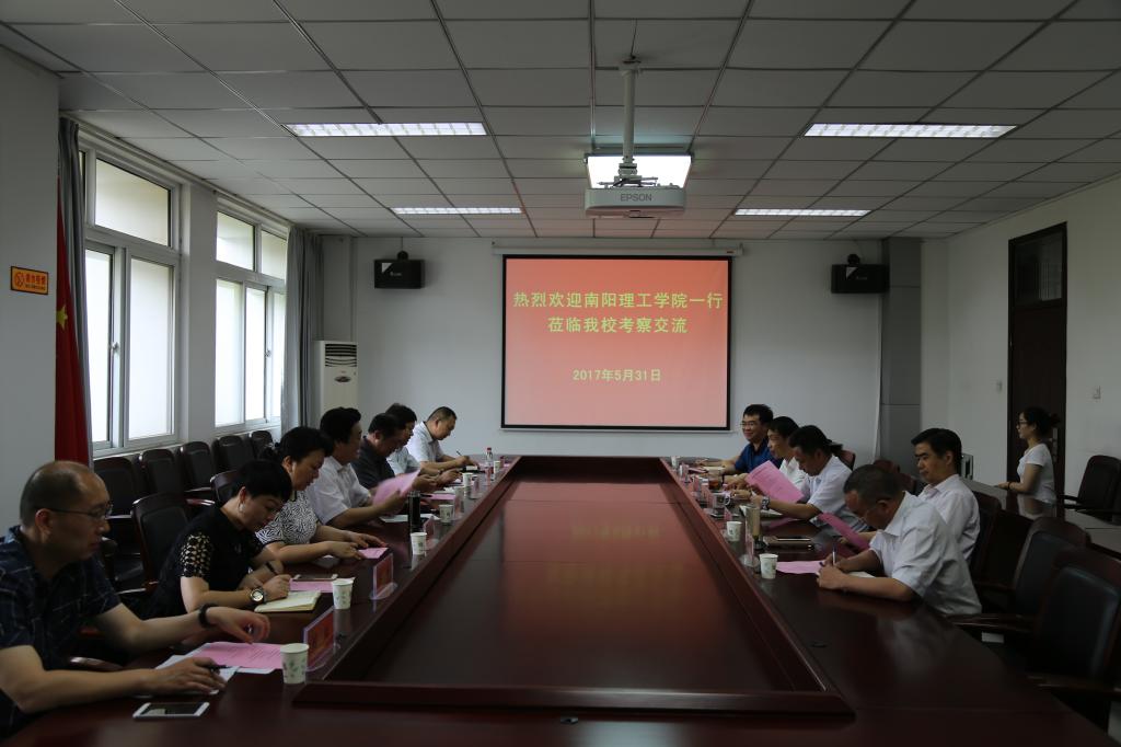 5月31日,南阳理工学院党委副书记秦鹏鸣、副校长陈世云一行9人到我校考察交流校企合作工作。我校党委副书记孙海、副院长郑直接待了来访客人,学校相关部门负责人参加了座谈交流。