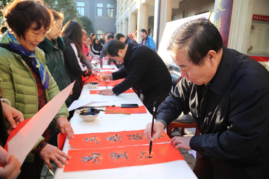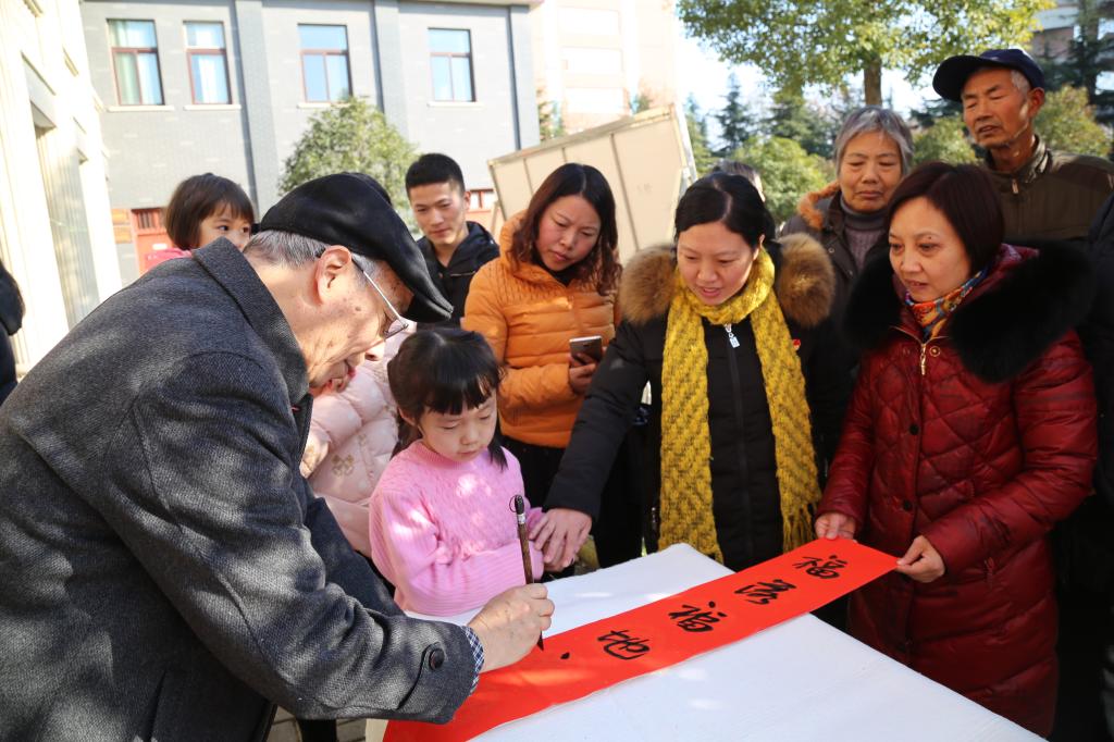 书法家们现场笔走龙蛇,挥豪泼墨。活动现场,热闹异常,不仅散发着浓浓的文化气息,更是被喜气洋洋的节日气氛所包围。“金猴留恋丰收年,彩凤欢啼盛世春”。“猴王辞年不懈奋斗千里志,金鸡献瑞同迎欢乐万家春”。春联既有挥别猴年、喜迎鸡年辞旧迎新的美好愿景,也有平安吉祥、和谐发展的励志高歌。我校教职工闻讯纷纷赶来,争相邀请书法家为自己写上一幅满意的春联,希望自己在新的一年里有新的气象。前来参加活动的教职工手捧散发墨香的春联,脸上洋溢着喜悦的笑容。一副副喜庆吉祥,散发着墨香的春联给腊月增添了更多的年味。