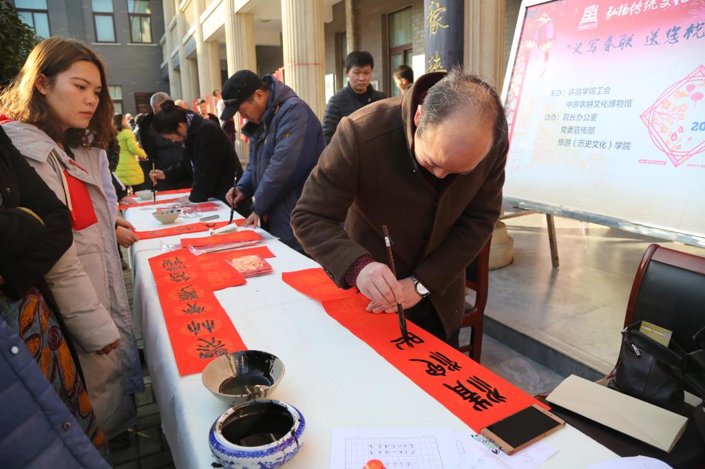 1月12日下午,我校中原农耕文化博物馆欢声笑语不断,欢欣和喜悦洋溢在每个人的脸上,欢乐祥和的鸡年春节序曲已经开始———由校工会、中原农耕文化博物馆共同举办的“义写春联•送您祝福”贺新春公益活动在这里举行。