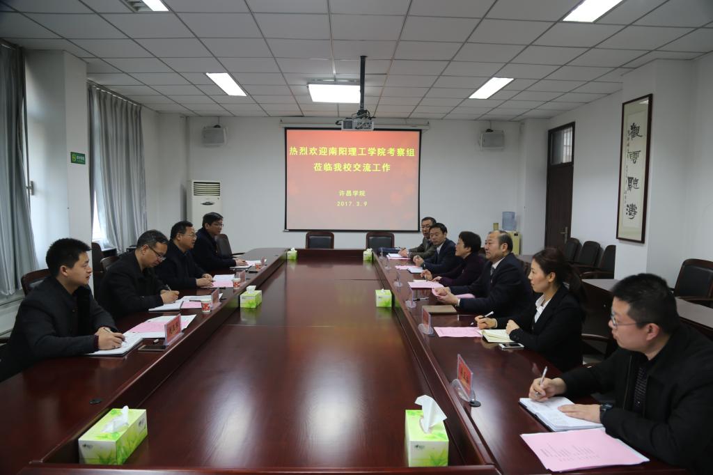 南阳理工学院副院长张世海表示,许昌学院底蕴丰厚,转型发展站位高、思路清、定位准,很多工作都凸显特色与创新,从顶层设计到基层实践很多方面都值得南阳理工学院学习借鉴。并就高层次人才引进、应用型人才培养、应用型课程建设等工作与我校领导进行了深入交流。
