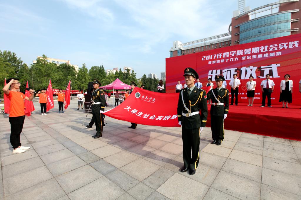 6月29日上午8点,我校2017年“青春喜迎十九大·坚定初心建新功”大学生暑期社会实践活动出征仪式在弘毅广场举行。院长赵继红,党委副书记马超、孙海,纪委书记罗凤英,副院长黄怡俐、郭涛,许昌团市委书记陈涛等出席仪式。河南大森机电股份有限公司董事长赵晓东、河南瑞贝卡发制品股份有限公司人力资源部部长陈玲杰、许昌蓝天救援队队长蒋耀军作为我校大学生社会实践活动合作单位代表莅临现场。各二级学院党总支书记、副书记、团总支书记,实践团队指导老师和社会实践学生代表近1200人参加仪式。出征仪式由团委书记谢依楠主持。