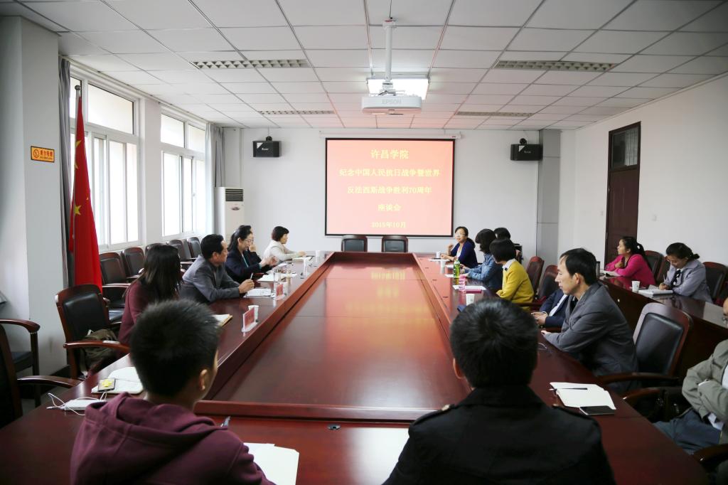 上午,我校纪念中国人民抗日战争暨世界反法西斯战争胜利70周年座谈会在办公楼第四会议室召开。座谈会由党委宣传部主办,社会科学教学部承办。校党委副书记马超出席座谈会,社会科学教学部主任刘琳娜、副主任张凤云,历史文化(旅游)学院副院长张国臣及社科部教师代表、法政学院师生代表、历史文化(旅游)学院师生代表参加座谈会并发言。座谈会由党委宣传部部长潘春彩主持。