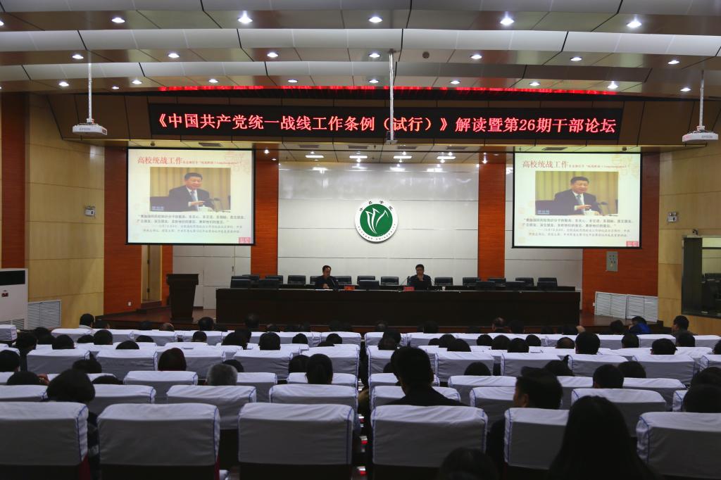 12月14日下午,我校在学术报告厅举办《中国共产党统一战线工作条例(试行)》专题讲座暨第26期干部论坛。河南省社会主义学院党组成员、副院长赵锡昌教授做客论坛,就《中国共产党统一战线工作条例(试行)》(以下简称《条例》)进行了深度解读。校领导赵继红、马超、赵正风、郑直、崔斌、郭涛、罗凤英出席会议。会议由党委副书记马超主持。
