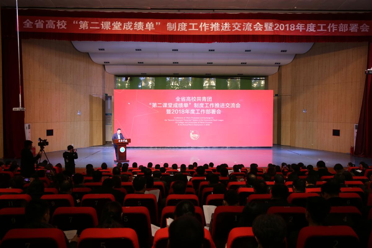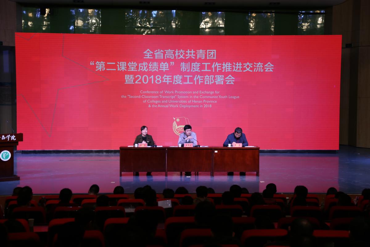 3月9日,全省高校共青团“第二课堂成绩单”制度工作推进交流会暨2018年度工作部署会在我校成功举办。共青团河南省委副书记王笃波、全国学校共青团研究中心活动部部长马海、许昌学院学校党委副书记孙海、副院长黄怡俐,共青团许昌市委书记陈涛、PU口袋校园副总经理郑岚出席会议,南京工业大学、河北建材职业技术学院、山东工商学院等高校相关负责人,全省高校团委书记及“第二课堂成绩单”制度相关负责老师,我校相关职能部门负责人共计300余人参加会议。