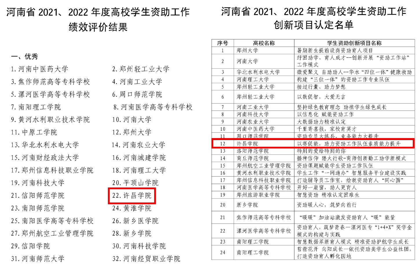 近日,河南省教育厅、国家开发银行河南省分行联合下发《关于发布全省高校和省属中职学校2021、2022 年度学生资助工作绩效评价结果的通知》,我校再次荣获全省高校学生资助工作绩效评价“优秀”等次,《以赛促能,助力资助工作队伍素质能力提升》项目获评高校学生资助工作创新项目。这也是我校自2017、2018年度以来连续三次获评全省高校学生资助工作绩效评价“优秀”等次。