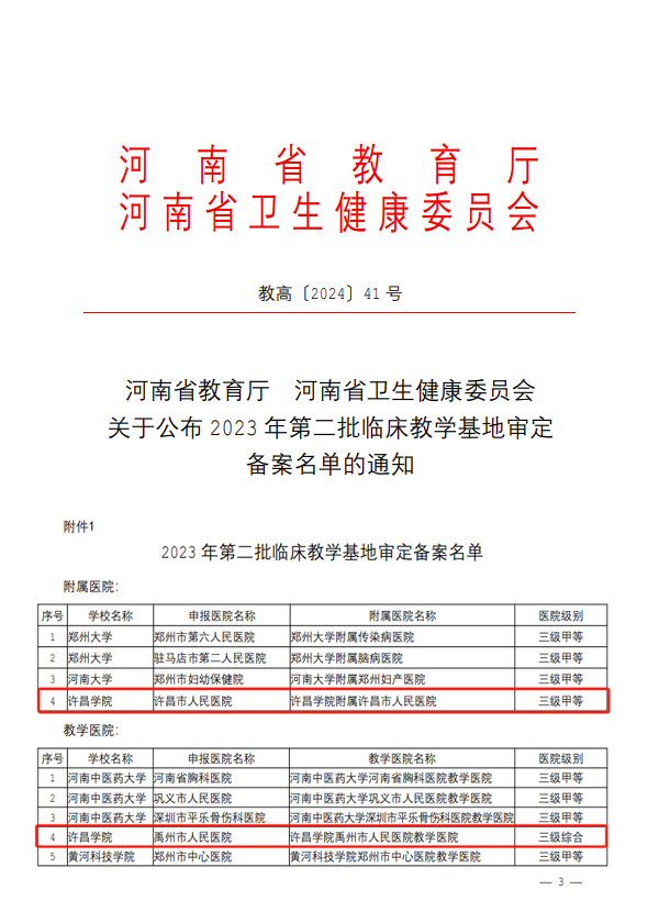 近日,河南省教育厅、河南省卫生健康委员会公布了《2023年第二批临床教学基地审定备案名单》(教高〔2024〕41号),本次全省共认定4所附属医院,7所教学医院,26所实习医院。其中,我校申报的许昌市人民医院和禹州市人民医院分别获批认定为附属医院和教学医院,我校临床教学基地建设获得重大突破。