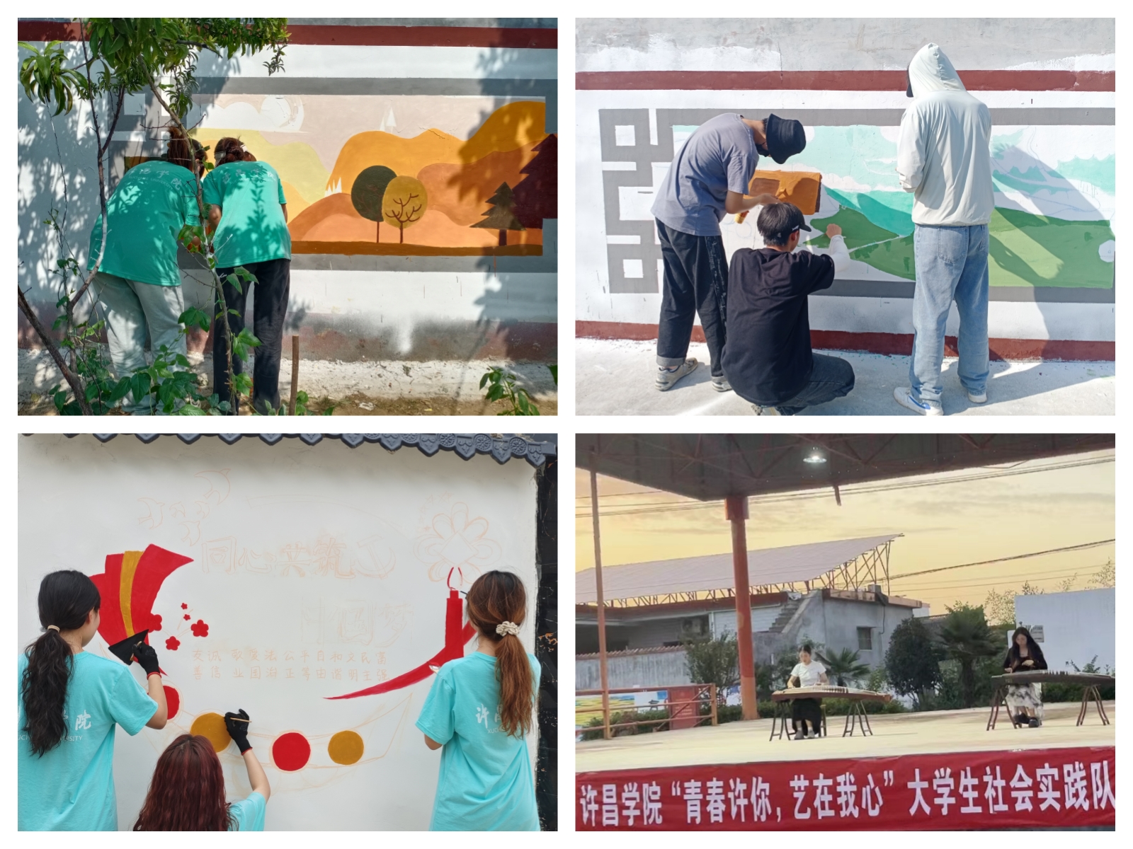 一笔一划,勾勒乡村。在建安区艾庄乡袁庄村,“夏花盎然,向阳而生,新时代,新青年助力乡村振兴”赴袁庄义务墙绘暑期社会实践队师生再次化身乡村“画师”,对村内墙体进行统一规划,用画笔和色彩妆点美丽乡村,一幅幅墙绘作品表露着青年志愿者的爱农情怀,展现了青年志愿者为乡村文化振兴“添砖加瓦”的青春担当。在鄢陵县柏梁镇姚家社区,商学院“绘梦柏梁”——齐绘乡风文明,共建社会温暖社会实践队成员积极参与村容整治、关爱老年人等志愿服务活动,绘制“同心共筑中国梦”主题墙绘,为乡村文化建设青春聚力。7月7日,“青春许你 艺在我心”社会实践队20余名师生来到袁庄村,为村民们送来一场格调高雅、精彩纷呈的文艺晚会,满足村民精神文化生活的需要。